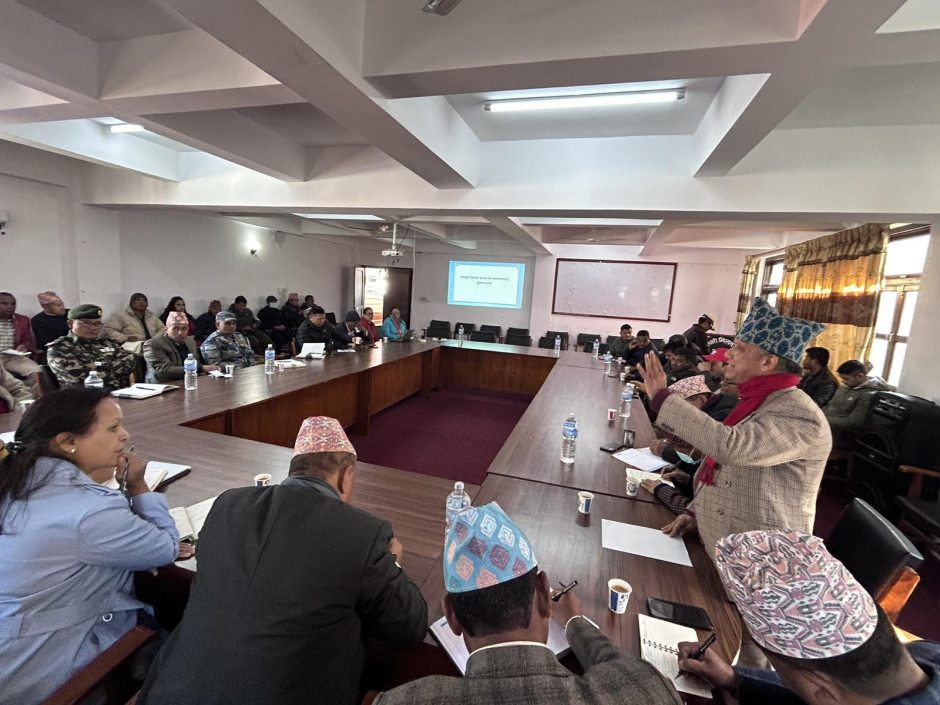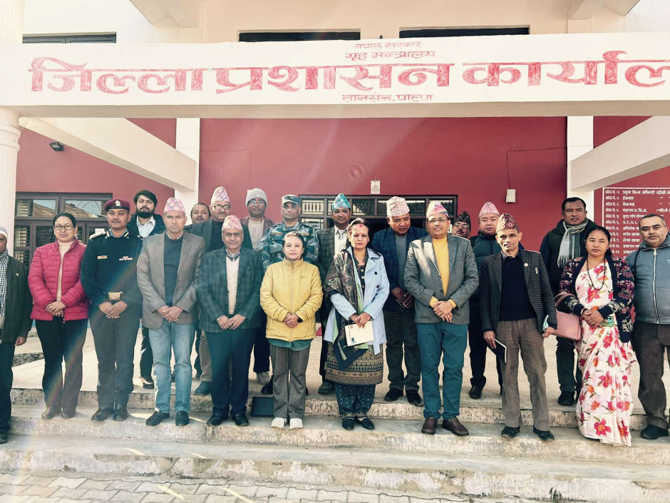मिति २०८०।९।२७ गतेका दिन पाल्पा जिल्लाका प्र.जि.अ. श्री आनन्द काफ्लेको अध्यक्षता तथा लुम्बिनी प्रदेश, मुख्यमन्त्री तथा मन्त्रीपरिषदको कार्यालयका प्रमुख सचिव श्री राधिका अर्यालज्यूको प्रमुख आतिथ्यतामा जिल्ला विपद् व्यवस्थापन समितिको बैठकको क्रममा लिइएको फो