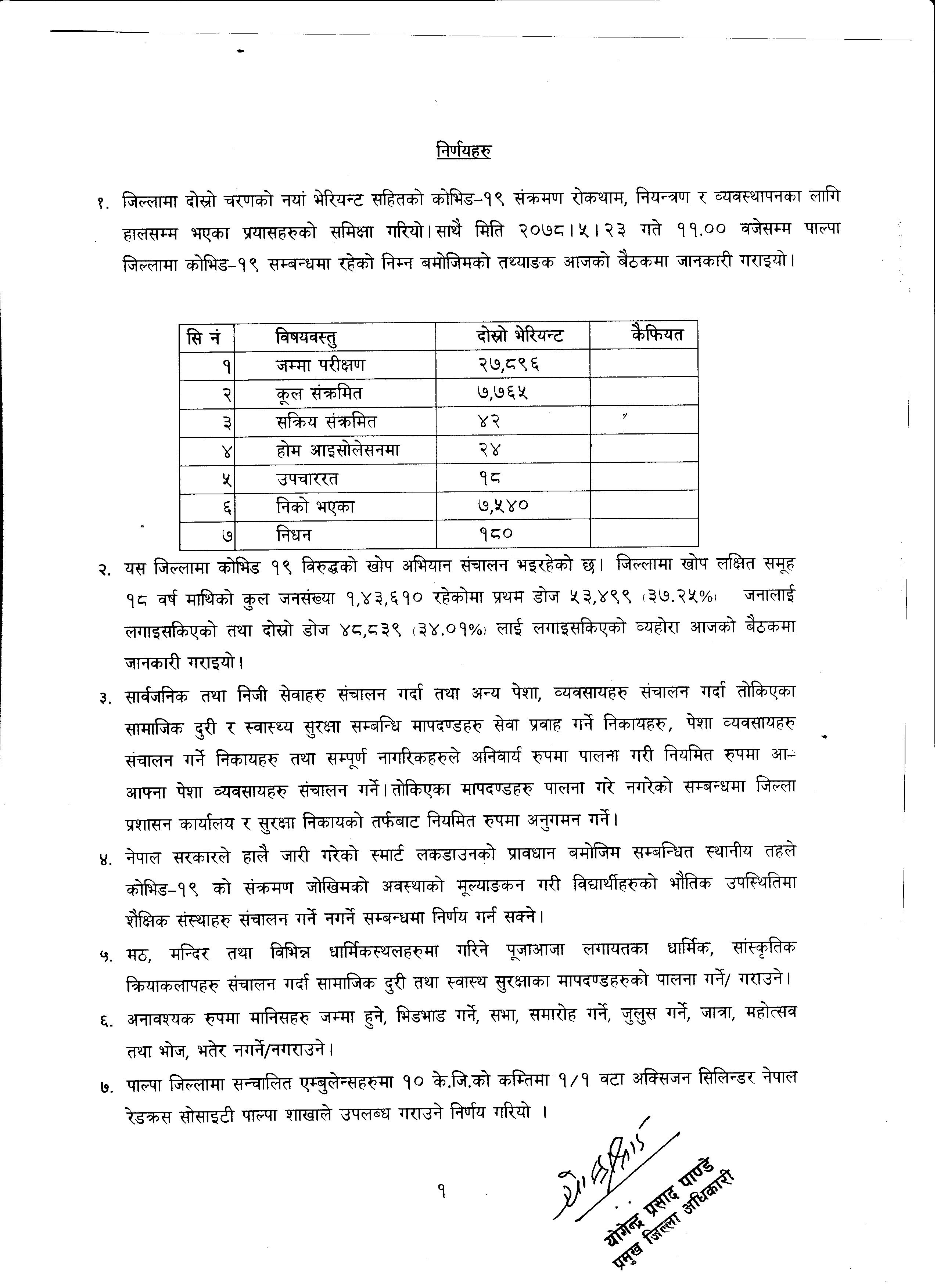 कोरोना भाईरस सम्बन्धी २०७७ जेष्ठ ३० गतेको जिल्ला प्रशासन कार्यालय पाल्पामा प्राप्त विवरण