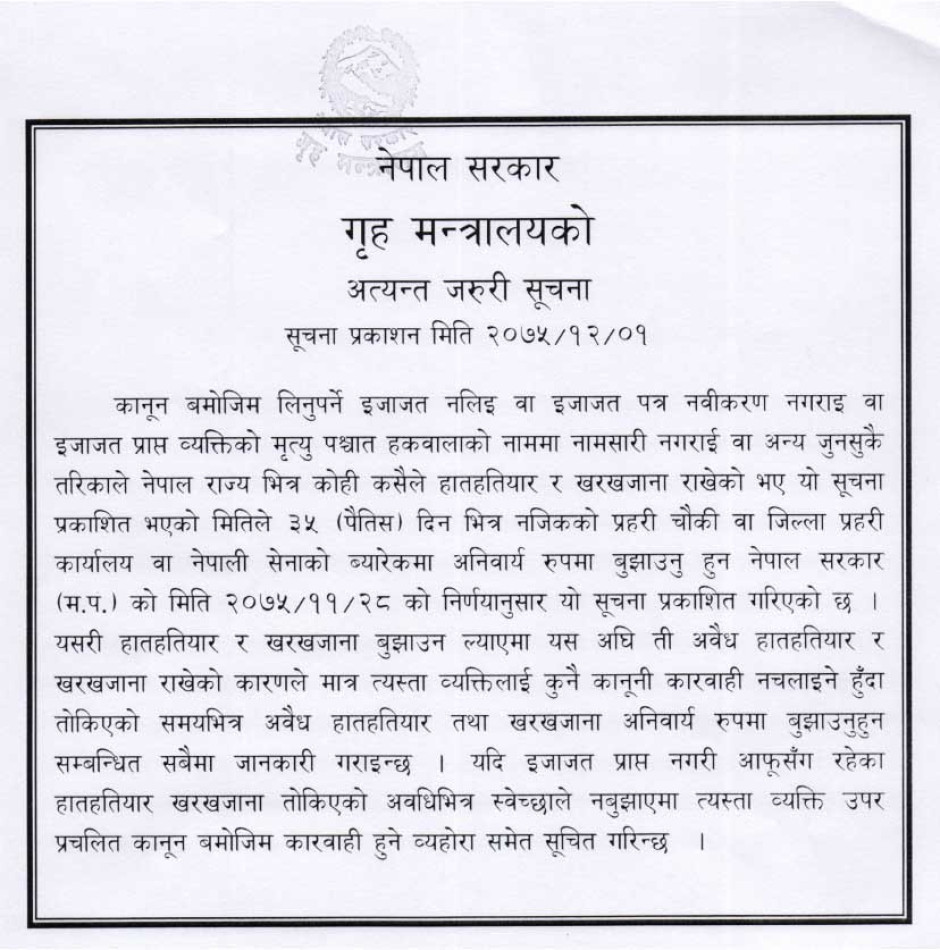 अवैध हातहतियार र खरखजाना बुझाउने सम्बन्धी सूचना