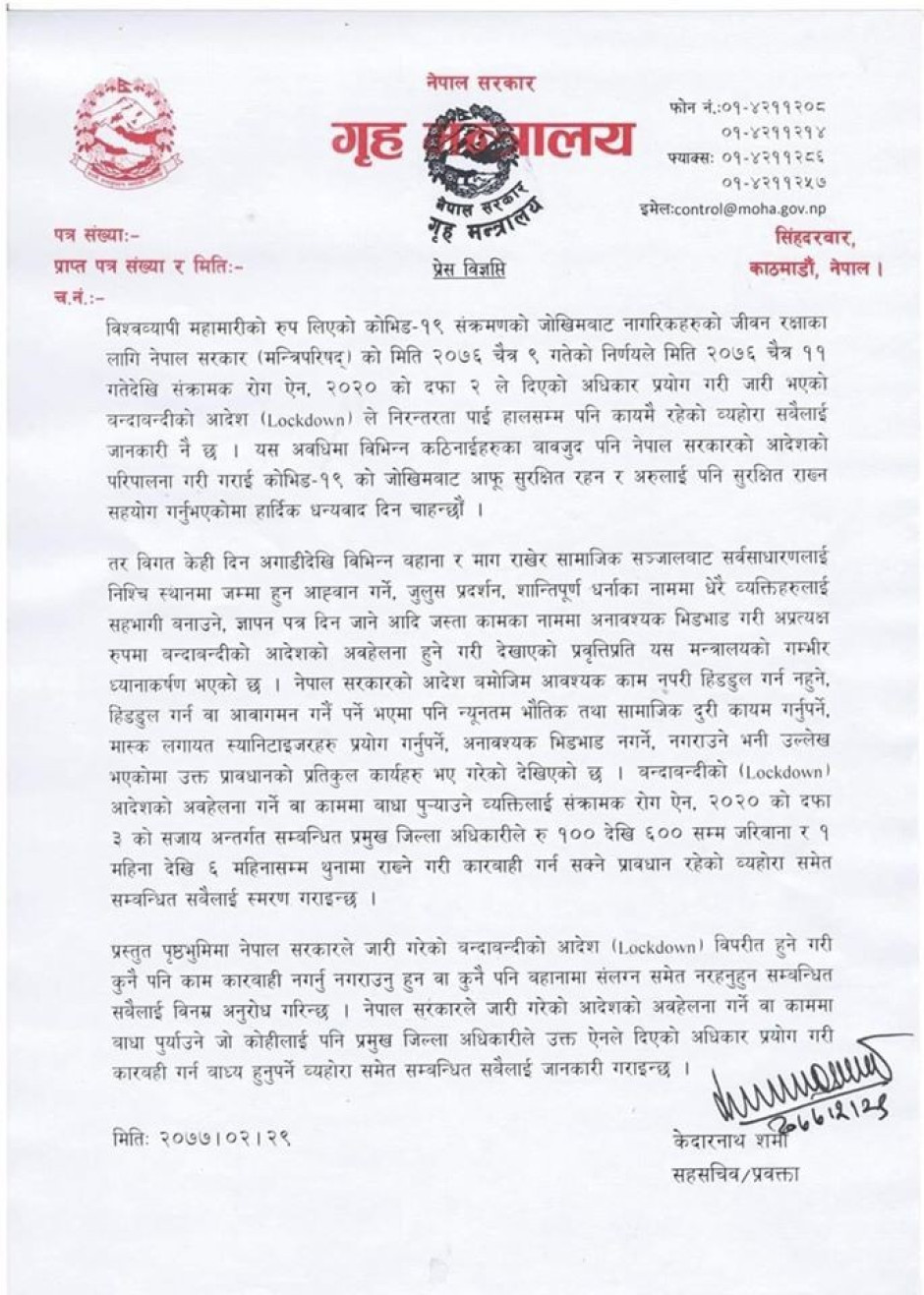 गृह मन्त्रालयद्वारा जारी प्रेस विज्ञप्ति