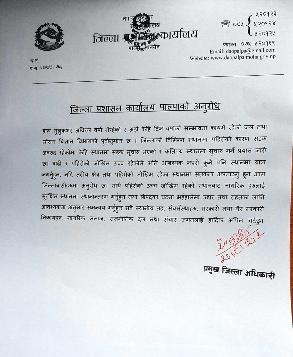 जिल्ला प्रशासन कार्यालय पाल्पाको अनुरोध