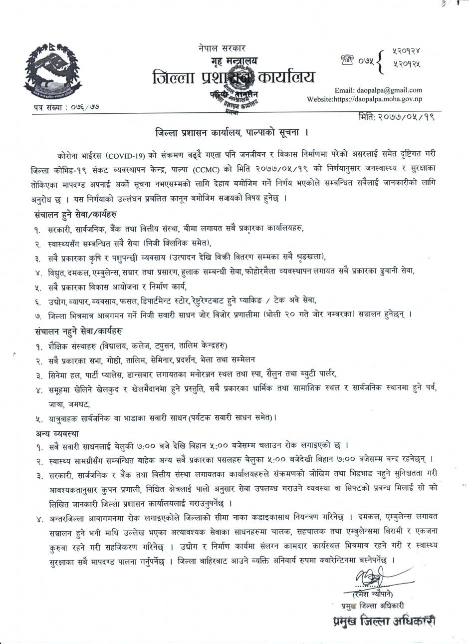 जिल्ला प्रशासन कार्यालय पाल्पाकाे सूचना । -२०७७/०५/०९