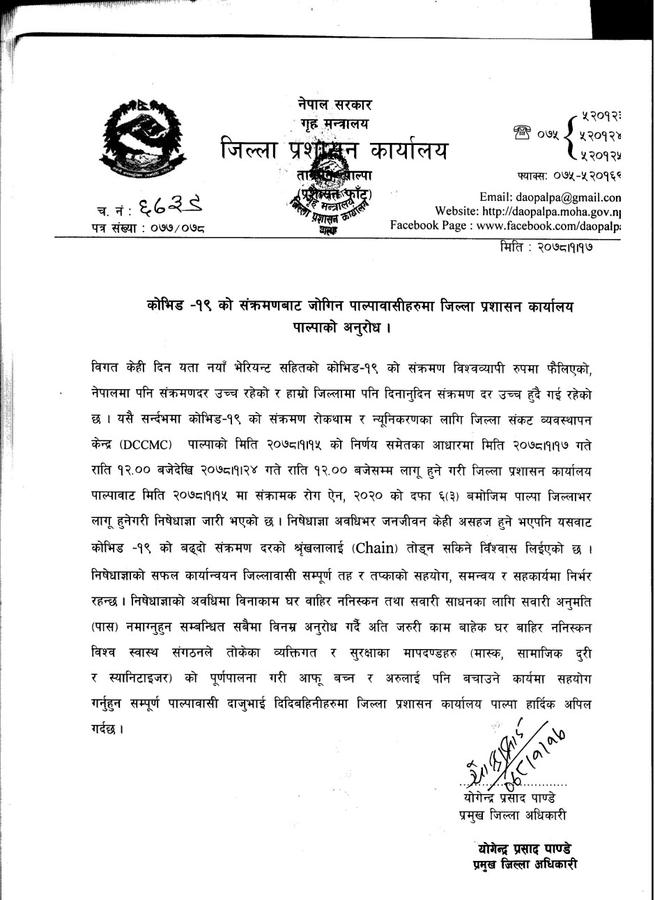 काेभिड-१९ काे संक्रमणबाट जाेगिन पाल्पावासीहरुमा जिल्ला प्रशासन कार्यालय पाल्पाकाे अनुराेध ।