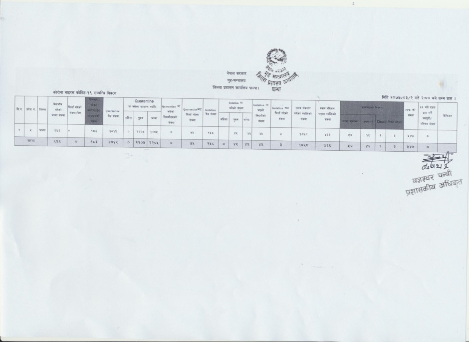 कोरोना भाईरस सम्बन्धी २०७७ असार २ गतेको जिल्ला प्रशासन कार्यालय पाल्पामा प्राप्त विवरण