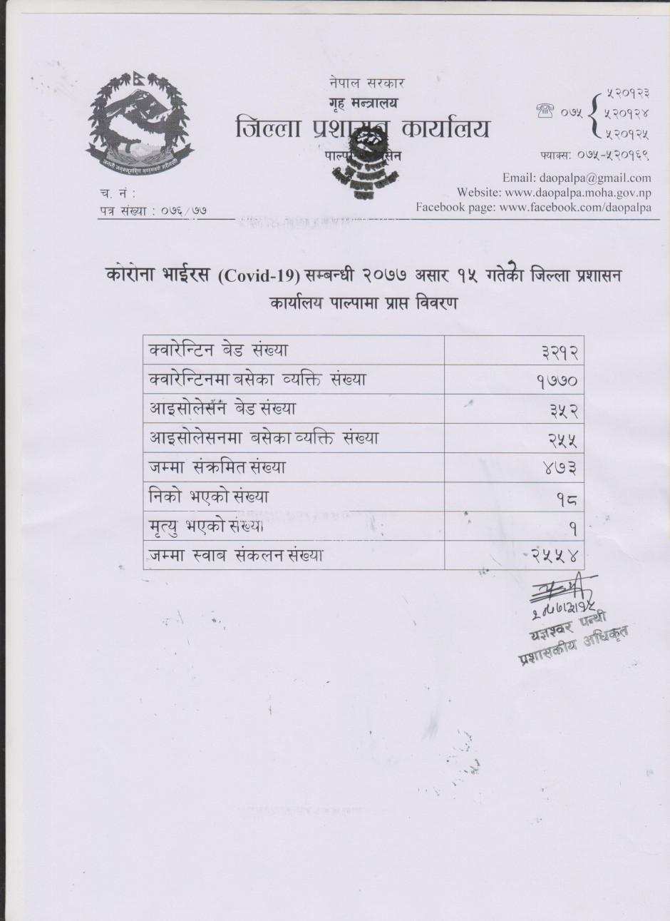 कोरोना भाईरस सम्बन्धी २०७७ असार १५ गतेको जिल्ला प्रशासन कार्यालय पाल्पामा प्राप्त विवरण