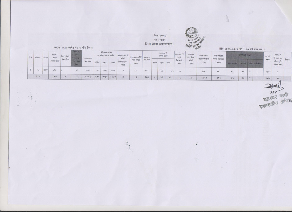 कोरोना भाईरस सम्बन्धी २०७७ असार ५ गतेको जिल्ला प्रशासन कार्यालय पाल्पामा प्राप्त विवरण