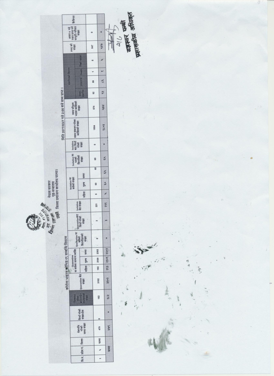 कोरोना भाईरस सम्बन्धी २०७७ असार ७ गतेको जिल्ला प्रशासन कार्यालय पाल्पामा प्राप्त विवरण