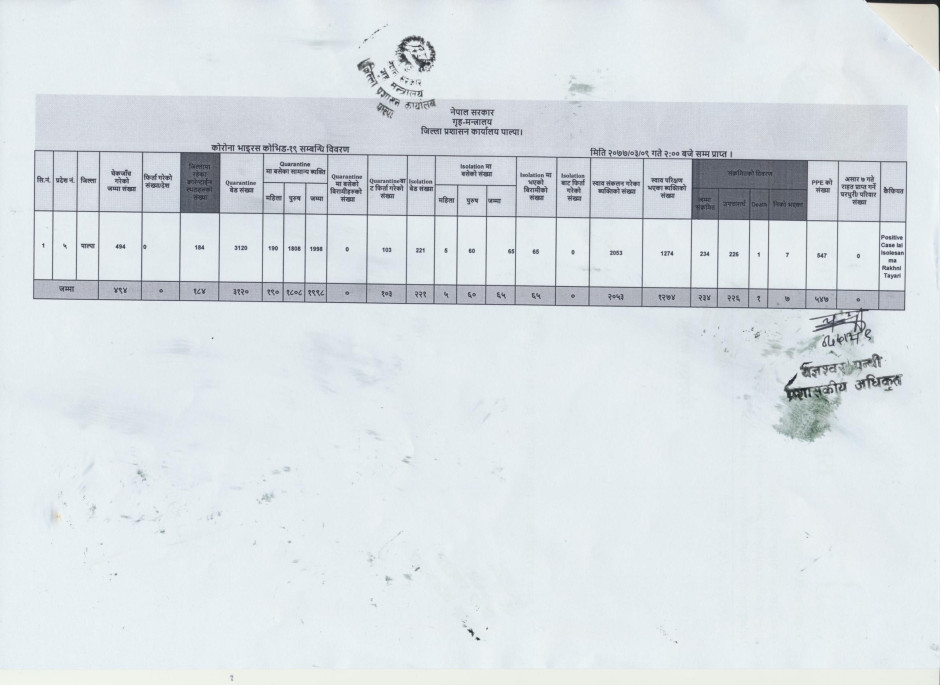 कोरोना भाईरस सम्बन्धी २०७७ असार ९ गतेको जिल्ला प्रशासन कार्यालय पाल्पामा प्राप्त विवरण