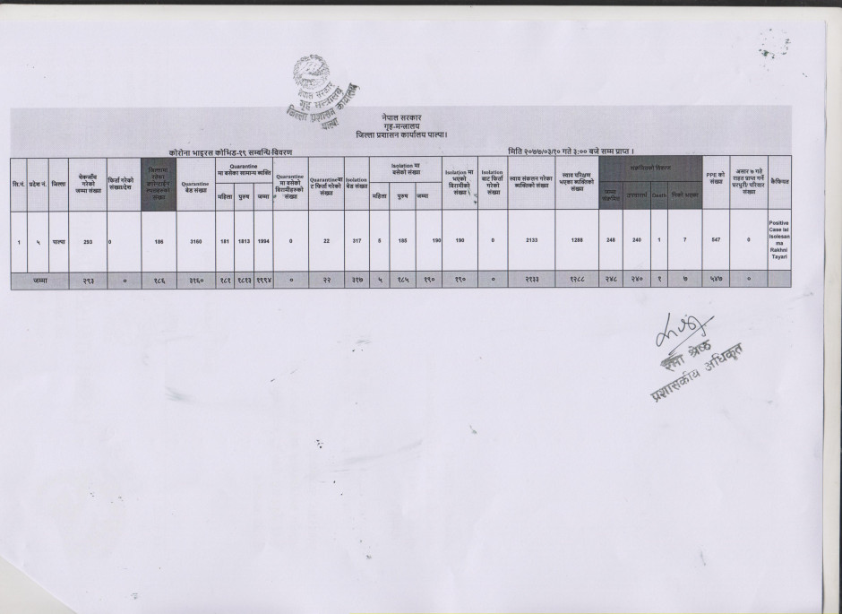 कोरोना भाईरस सम्बन्धी २०७७ असार १० गतेको जिल्ला प्रशासन कार्यालय पाल्पामा प्राप्त विवरण