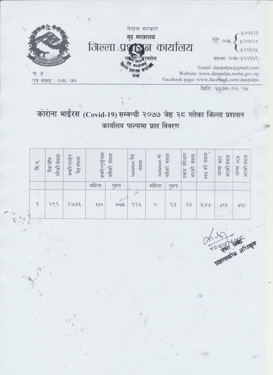 कोरोना भाईरस सम्बन्धी २०७७ जेष्ठ २८ गतेको जिल्ला प्रशासन कार्यालय पाल्पामा प्राप्त विवरण