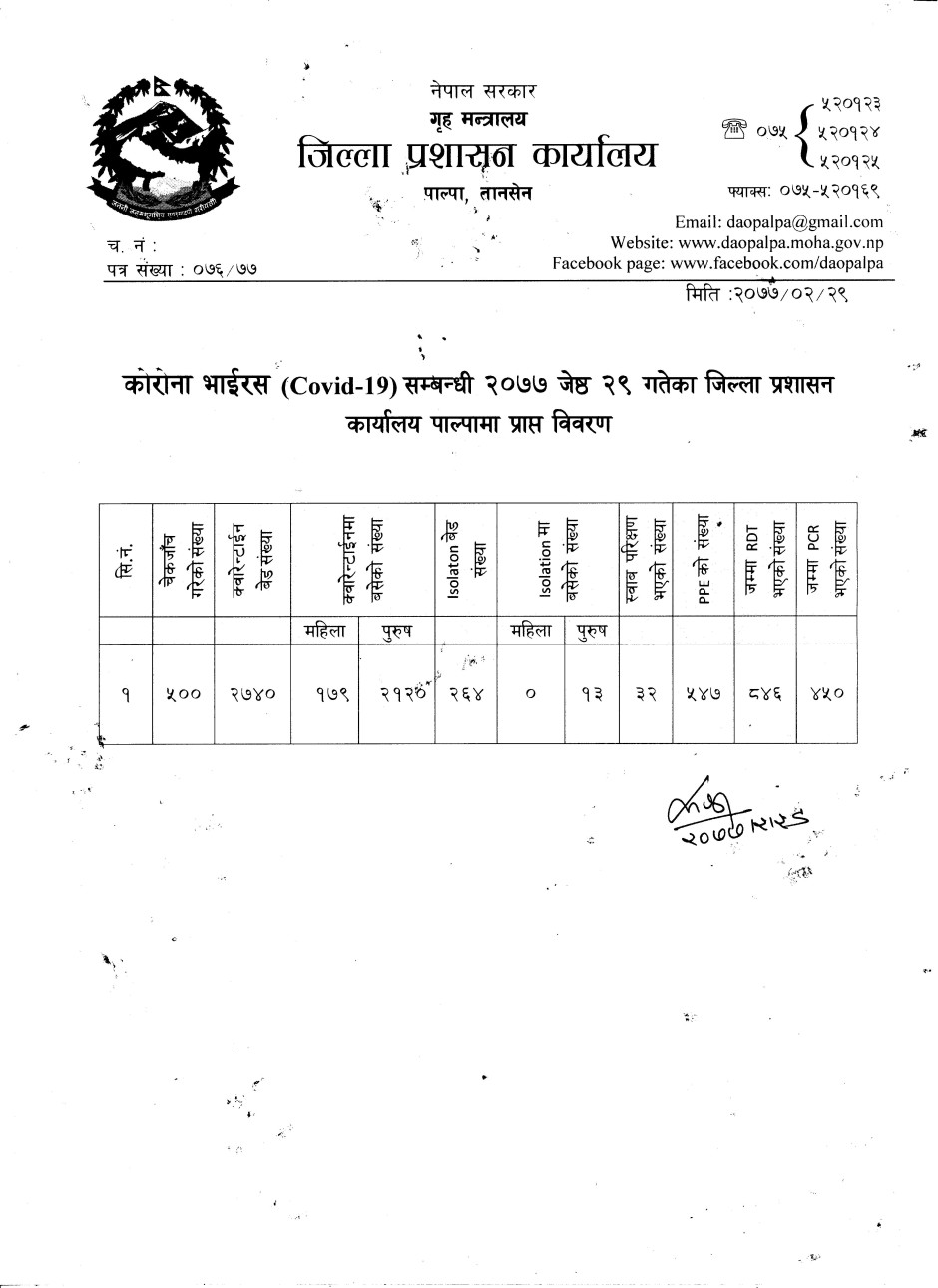 कोरोना भाईरस सम्बन्धी २०७७ जेष्ठ २९ गतेको जिल्ला प्रशासन कार्यालय पाल्पामा प्राप्त विवरण