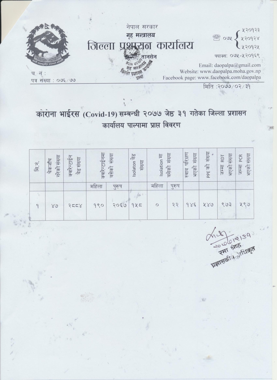 कोरोना भाईरस सम्बन्धी २०७७ जेष्ठ ३१ गतेको जिल्ला प्रशासन कार्यालय पाल्पामा प्राप्त विवरण