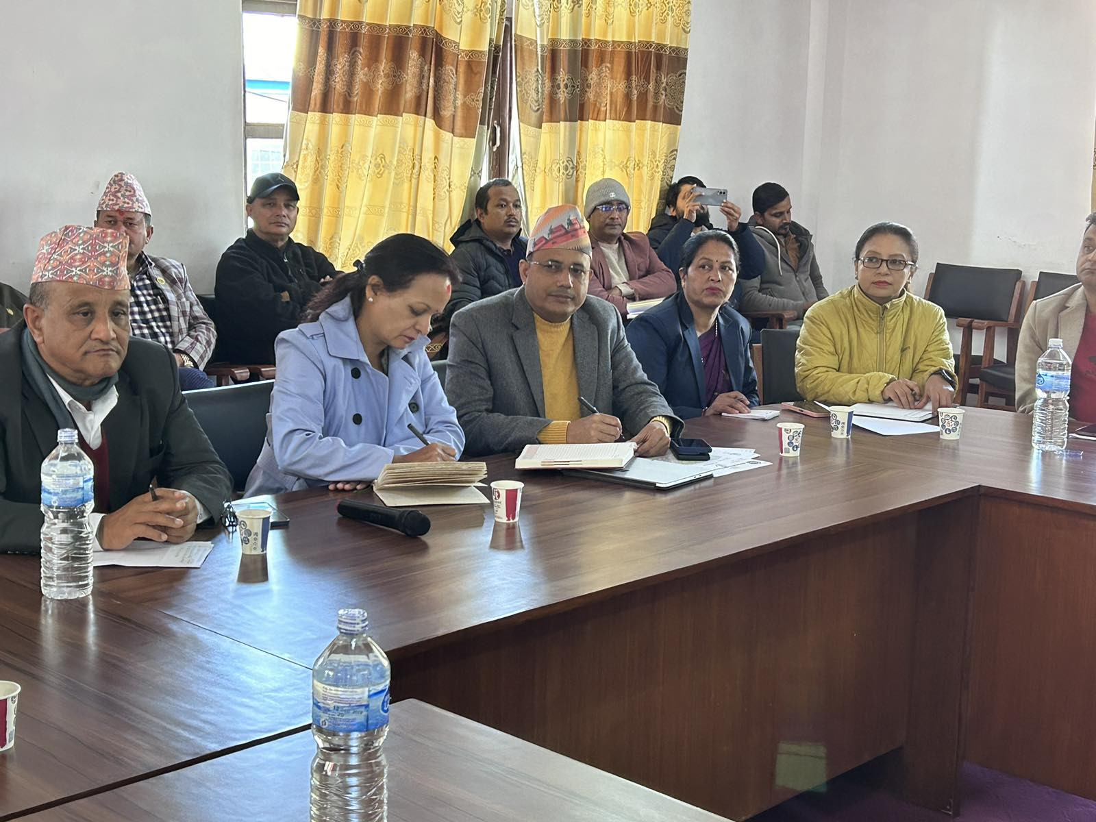 मिति २०८०।९।२७ गतेका दिन पाल्पा जिल्लाका प्र.जि.अ. श्री आनन्द काफ्लेको अध्यक्षता तथा लुम्बिनी प्रदेश, मुख्यमन्त्री तथा मन्त्रीपरिषदको कार्यालयका प्रमुख सचिव श्री राधिका अर्यालज्यूको प्रमुख आतिथ्यतामा जिल्ला विपद् व्यवस्थापन समितिको बैठकको क्रममा लिइएको फो
