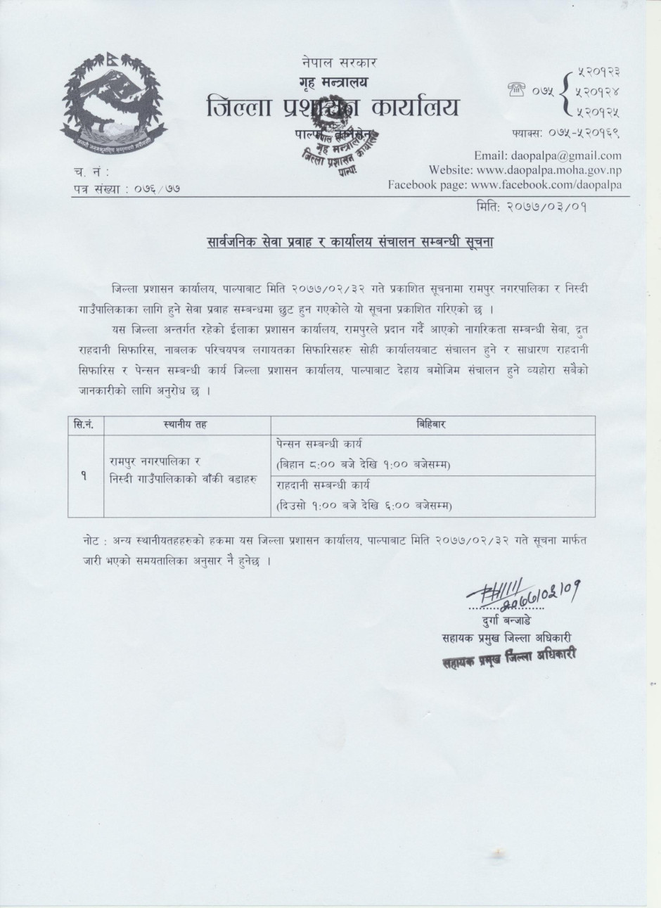 रामपुर नगरपालिका र निस्दी गाउँपालिकाका सेवाग्राहीहरुको लागि २ सिफ्टमा सार्वजनिक सेवा प्रवाह सम्वन्धी सूचना !!!