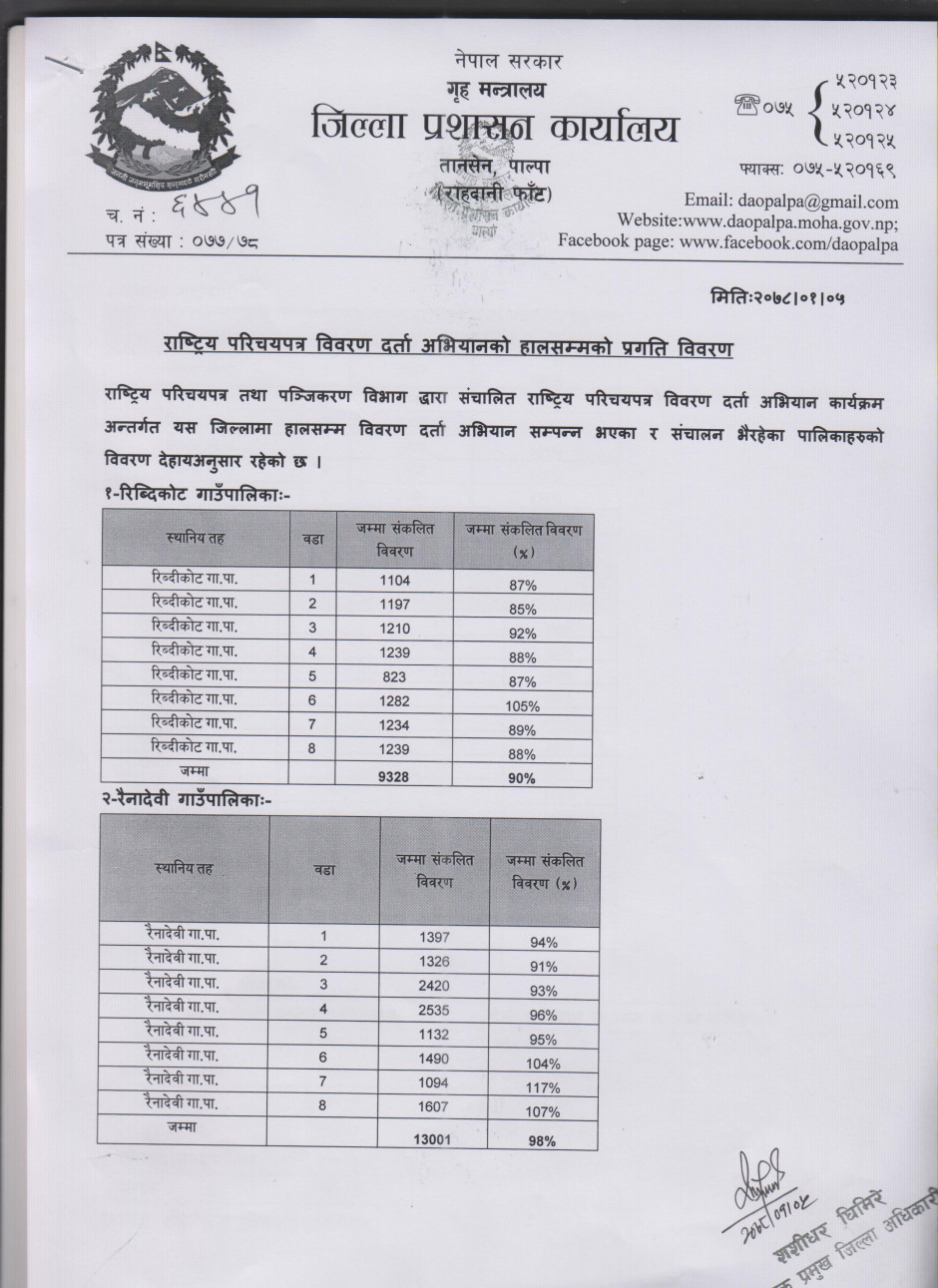 राष्ट्रिय परिचयपत्र विवरण दर्ता अभियानकाे हालसम्मकाे प्रगति विवरण ।