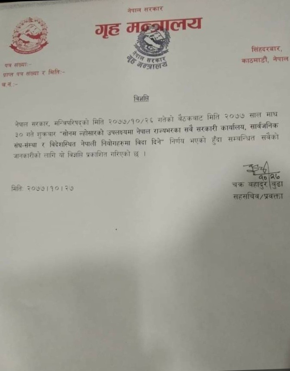 सोनम ल्होसारको उपलक्ष्यमा सार्बजनिक विदा सम्बन्धमा